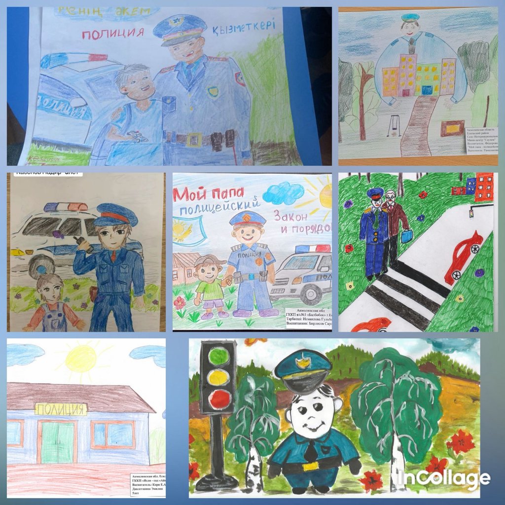 Мектеп жасына дейінгі балалардың құқықтық сауаттылығы туралы алғашқы түсініктерін қалыптастыру, шығармашылық қызметі арқылы полиция қызметкерінің мамандығын құрметтеуге тәрбиелеу мақсатында «Менің әкем - полиция қызметкері» атты аудандық сурет көрмесі өткізілді.
